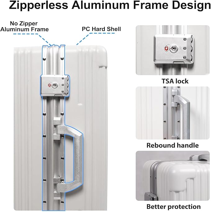 - Top and Side Aluminum Carry Handles provide sturdy lifting options, ensuring effortless handling whether you’re lifting it into an overhead compartment or pulling it along.